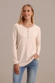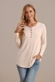 A heathered knit top featuring a rounded neckline, functional front buttons, long sleeves and a rounded hem.