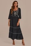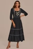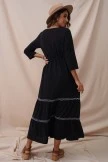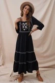 So pretty and femme, this maxi dress is featured in a longline tiered silhouette with 3/4 sleeves and embroidered flowers throughout for the perfect, effortless look.