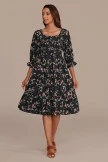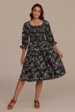 Black Floral 3/4 Sleeve Square Neck Smocked Tiered Midi Dress