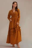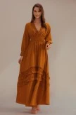 The Dress is all things beauty and grace. With a Self-tie back detail that adds boho flair, 3/4 sleeves with smocked cuffs, and beautiful camel color, this dress is guaranteed to win your heart!