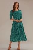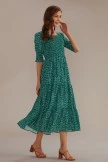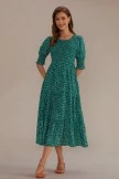 Add a ditsy print midi dress to your closet today. With a round neck, a smocked bodice, short puff sleeves and a tiered flared skirt sitting below the knee. Style with heeled wedges for a comfortable smart casual daytime outfit.