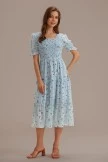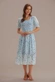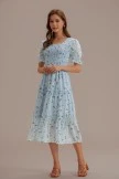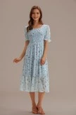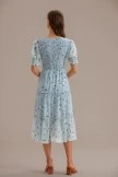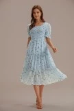 The light blue floral of this skirt is very fresh, the sleeves and hem are designed with pleats, and the length is below the knee, which makes it very beautiful to wear.