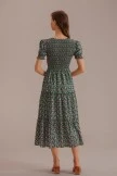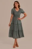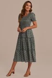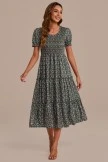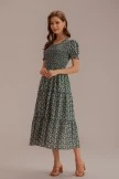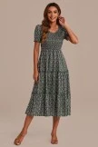 The floral dress bodice has smocked puff short sleeves with a smocked back. It has a tiered + ruffled skirt. The floral print feels fresh + feminine.