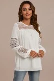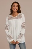 Lace insert on chest and sleeves, keyhole button closure at back neck, long sleeves with elastic at the cuff, scoop neck.