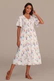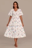 This pretty dress features a smocked bodice, v-neck, romantic flared sleeves, and tiered skirt. The florals feature the perfect color combo for fall weather. Pair with a cardigan for cooler weather and your favorite loafers.