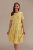 More gingham please! Perfect for sunny summer days, this knee-length dress will have you picnic ready in no time. It’s accentuated with plaid details, a tiered, ruffle skirt, and a bright yellow print.